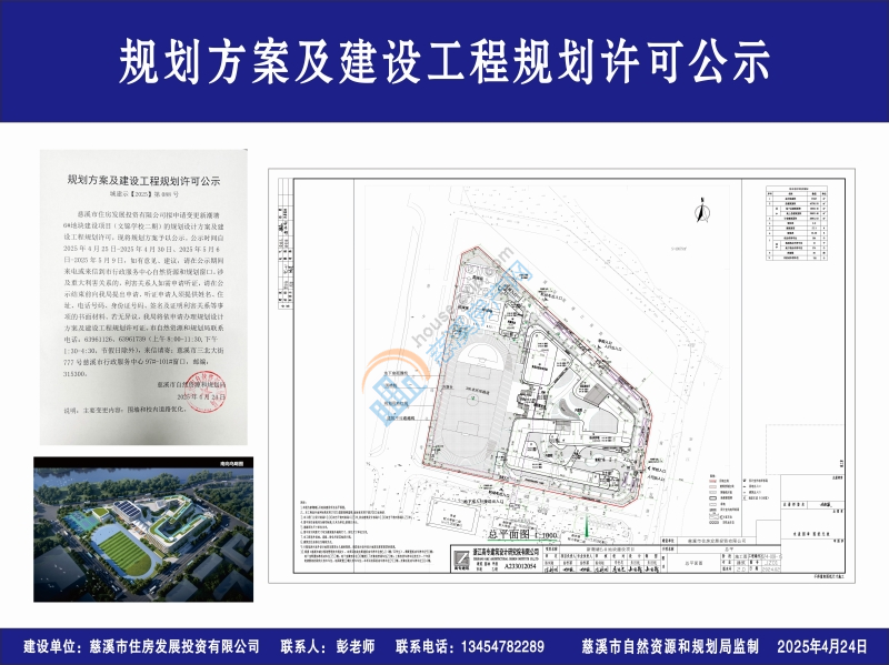 慈溪市住房发展投资有限公司拟申请变更新潮塘6#地块建设项目(文锦学校二期)的规划设计方案及建设工程规划许可,现将规划方案予以公示。公示时间自2025年4月25日-2025年4月30日、2025年5月6日-2025年5月9日,如有意见、建议,请在公示期间来电或来信到市行政服务中心自然资源和规划窗口。涉及重大利害关系的,利害关系人如需申请听证,请在公示结束前向我局提出申请,听证申请人须提供姓名、住址、电话号码、身份证号码、签名及证明利害关系等事项的书面材料。若无异议,我局将依申请办理规划设计方案及建设工程规划许可证。市自然资源和规划局联系电话:63961126、63961739(上午8:00-11:30,下午1:30-4:30,节假日除外),来信请寄:慈溪市三北大街777号慈溪市行政服务中心97#-101#窗口,邮编:315300。