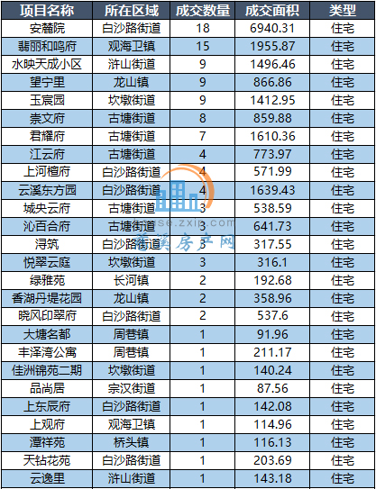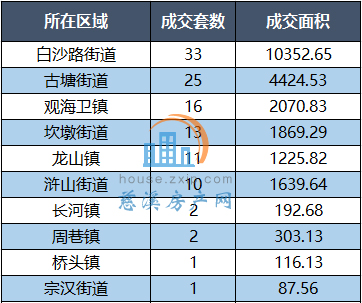 其中,白沙路街道以月成交33套居于榜首,其次是古塘街道以25套的成交量列第二。