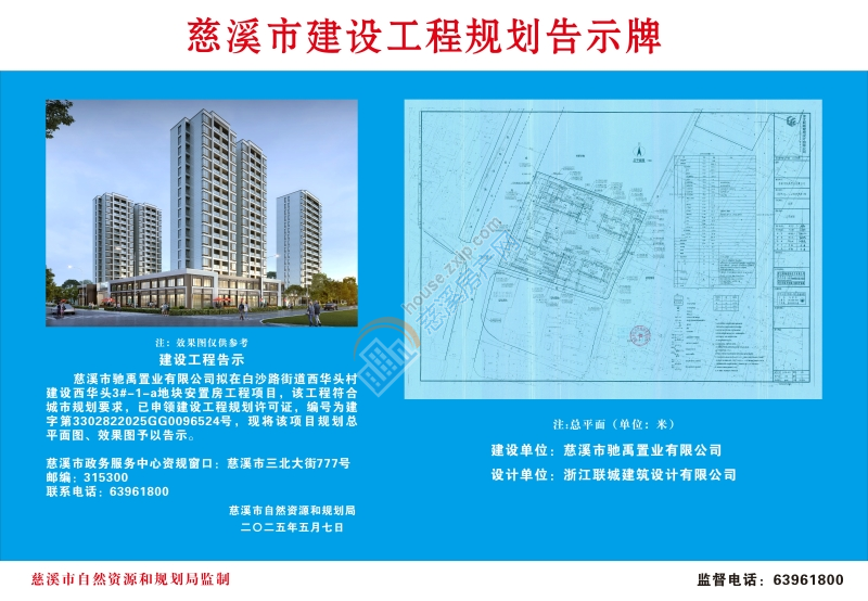 慈溪市驰禹置业有限公司拟在白沙路街道西华头村建设西华头3#-1-a地块安置房工程项目,该工程符合城市规划要求,已申领建设工程规划许可证,编号为建字第3302822025GG0096524号,现将该项目规划总平面图、效果图予以告示。