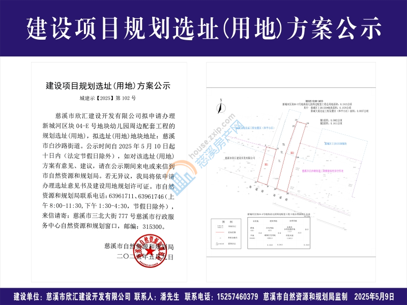 慈溪市欣汇建设开发有限公司拟申请办理新城河区块04-E号地块幼儿园周边配套工程的规划选址(用地),拟选址(用地)地块地址:慈溪市白沙路街道。公示时间自2025年5月10日起十日内(法定节假日除外),如对该选址(用地)方案有意见、建议,请在公示期间来电或来信到市自然资源和规划局。若无异议,我局将依申请办理选址意见书及建设用地规划许可证。市自然资源和规划局联系电话:63961711、63961746(上午8:00-11:30,下午1:30-4:30,节假日除外),来信请寄:慈溪市三北大街777号慈溪市行政服务中心自然资源和规划窗口,邮编:315300。
