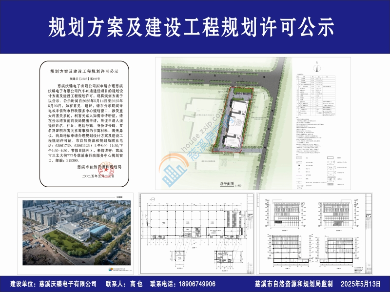 慈溪沃臻电子有限公司拟申请办理慈溪沃臻电子有限公司汽车4S店建设项目的规划设计方案及建设工程规划许可,现将规划方案予以公示。公示时间自2025年5月14日至2025年5月23日,如有意见、建议,请在公示期间来电或来信到市行政服务中心规划窗口。涉及重大利害关系的,利害关系人如需申请听证,请在公示结束前向我局提出申请,听证申请人须提供姓名、住址、电话号码、身份证号码、签名及证明利害关系等事项的书面材料。若无异议,我局将依申请办理规划设计方案及建设工程规划许可证。市自然资源和规划局联系电话:63961739、63961126(上午8:00-11:30,下午1:30-4:30,节假日除外),来信请寄:慈溪市三北大街777号慈溪市行政服务中心规划窗口,邮编:315300。