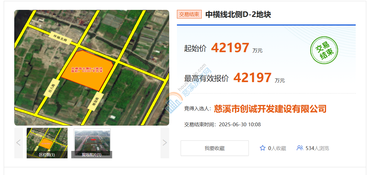 4425元/㎡!慈溪市创诚开发建设竞得中横线北侧D-2宅地!