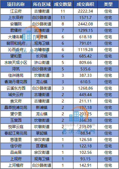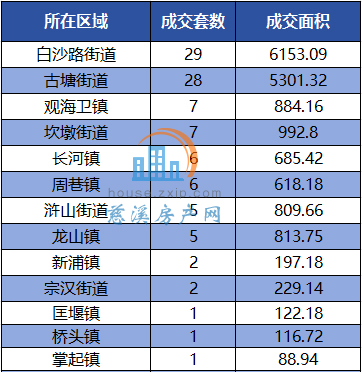 其中,白沙路街道以月成交29套居于榜首,其次是古塘街道以28套的成交量列第二。