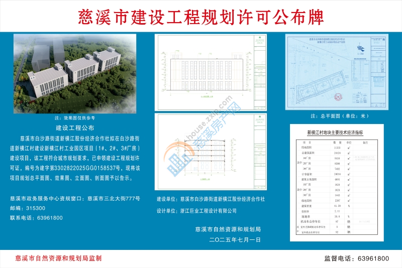 慈溪市白沙路街道新横江股份经济合作社拟在白沙路街道新横江村建设新横江村工业园区项目(1#、2#、3#厂房)建设项目,该工程符合城市规划要求,已申领建设工程规划许可证,编号为建字第3302822025GG0158537号,现将该项目规划总平面图、效果图予以告示。