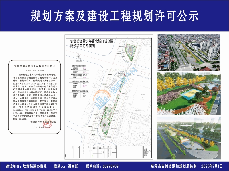 坎墩街道办事处拟申请办理坎墩街道青少年宫北路口袋公园建设项目的规划设计方案及建设工程规划许可,现将规划方案予以公示。公示时间自2025年7月2日至2025年7月11日,如有意见、建议,请在公示期间来电或来信到市行政服务中心规划窗口。涉及重大利害关系的,利害关系人如需申请听证,请在公示结束前向我局提出申请,听证申请人须提供姓名、住址、电话号码、身份证号码、签名及证明利害关系等事项的书面材料。若无异议,我局将依申请办理规划设计方案及建设工程规划许可证。市自然资源和规划局联系电话:63961739、63961126(上午8:00-11:30,下午2:00-5:00,节假日除外),来信请寄:慈溪市三北大街777号慈溪市行政服务中心规划窗口,邮编:315300。