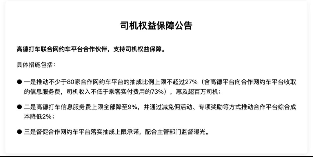 聚合平台高德打车也发布通知称,联合网约车平台合作伙伴推动不少于80家合作网约车平台的抽成比例上限不超过27%。高德打车还表示,将信息服务费上限全部降至9%,并通过减免佣金活动、专项奖励等方式推动合作平台综合成本降低2%。