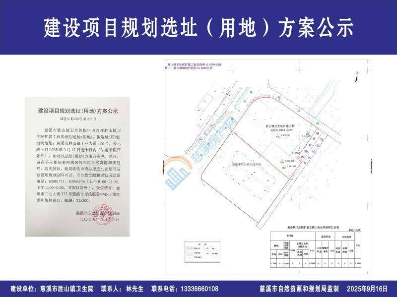 慈溪市胜山镇卫生院拟申请办理胜山镇卫生院扩建工程的规划选址(用地),拟选址(用地)地块地址:慈溪市胜山镇工业大道388号。公示时间自2025年9月17日起十日内(法定节假日除外),如对该选址(用地)方案有意见、建议,请在公示期间来电或来信到市自然资源和规划局。若无异议,我局将依申请办理选址意见书及建设用地规划许可证。市自然资源和规划局联系电话:63961711、63961746(上午8:00-11:30,下午2:00-5:00,节假日除外),来信请寄:慈溪市三北大街777号慈溪市行政服务中心自然资源和规划窗口,邮编:315300。