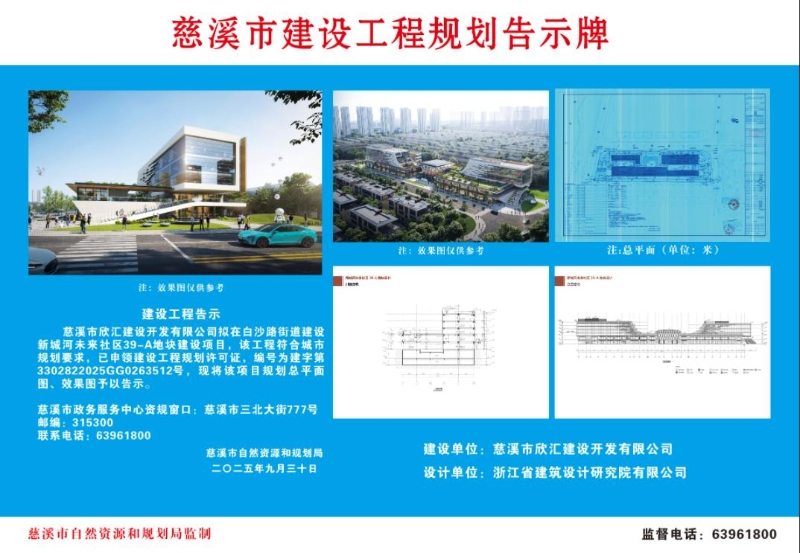 慈溪市欣汇建设开发有限公司拟在白沙路街道建设新城河未来社区39-A地块建设项目,该工程符合城市规划要求,已申领建设工程规划许可证,编号为建字第3302822025GG0263512号,现将该项目规划总平面图、效果图予以告示。