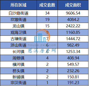 其中,白沙路街道以月成交34套居于榜首,其次是坎墩街道以19套的成交量列第二。