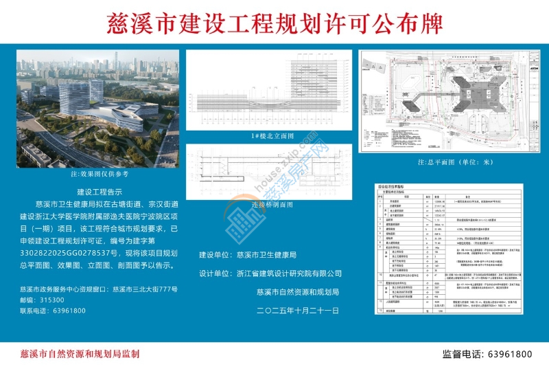 慈溪市卫生健康局拟在古塘街道、宗汉街道建设浙江大学医学院附属邵逸夫医院宁波院区项目(一期)项目,该工程符合城市规划要求,已申领建设工程规划许可证,编号为建字第3302822025GG0278537号,现将该项目规划总平面图、效果图予以告示。