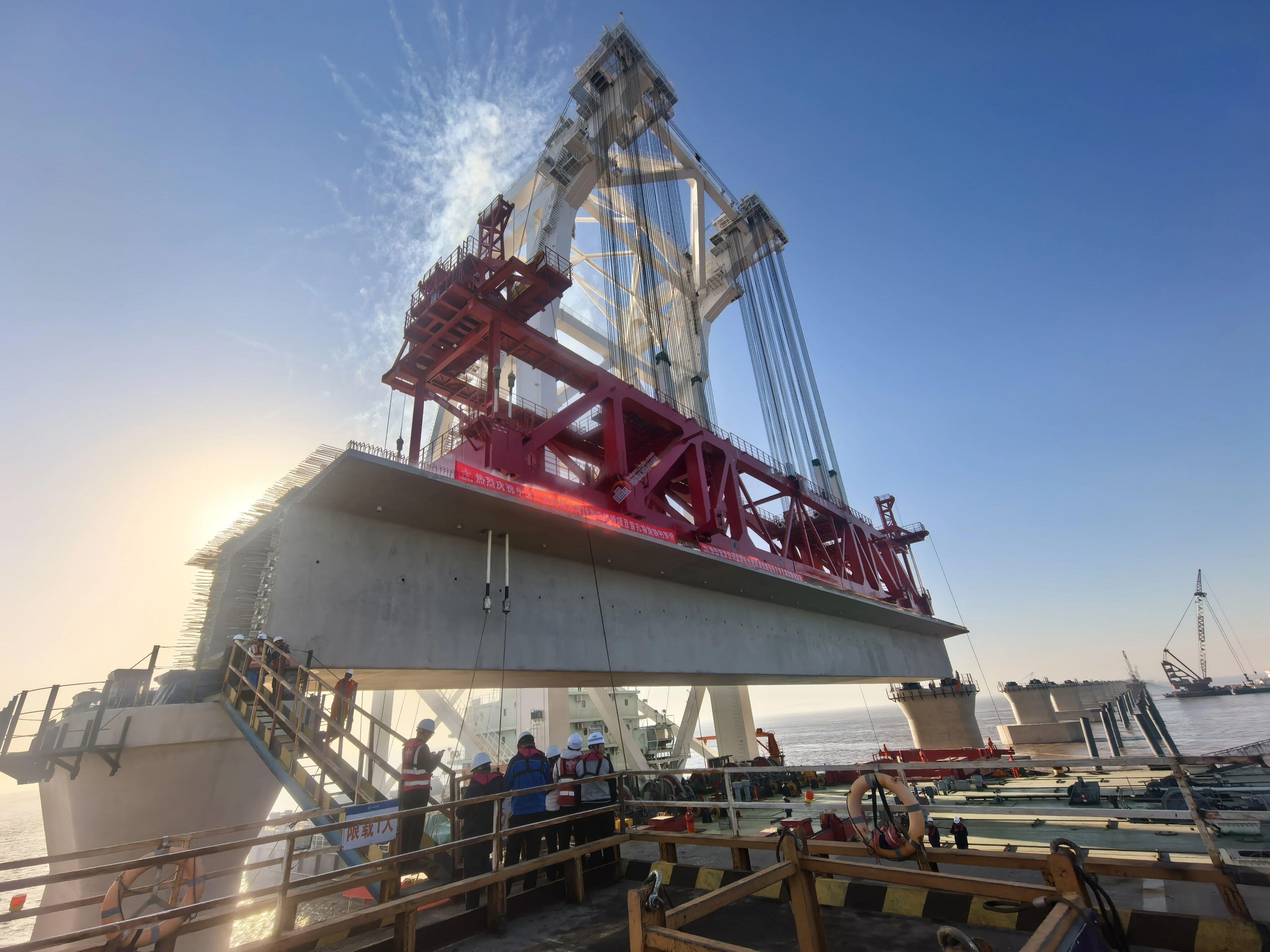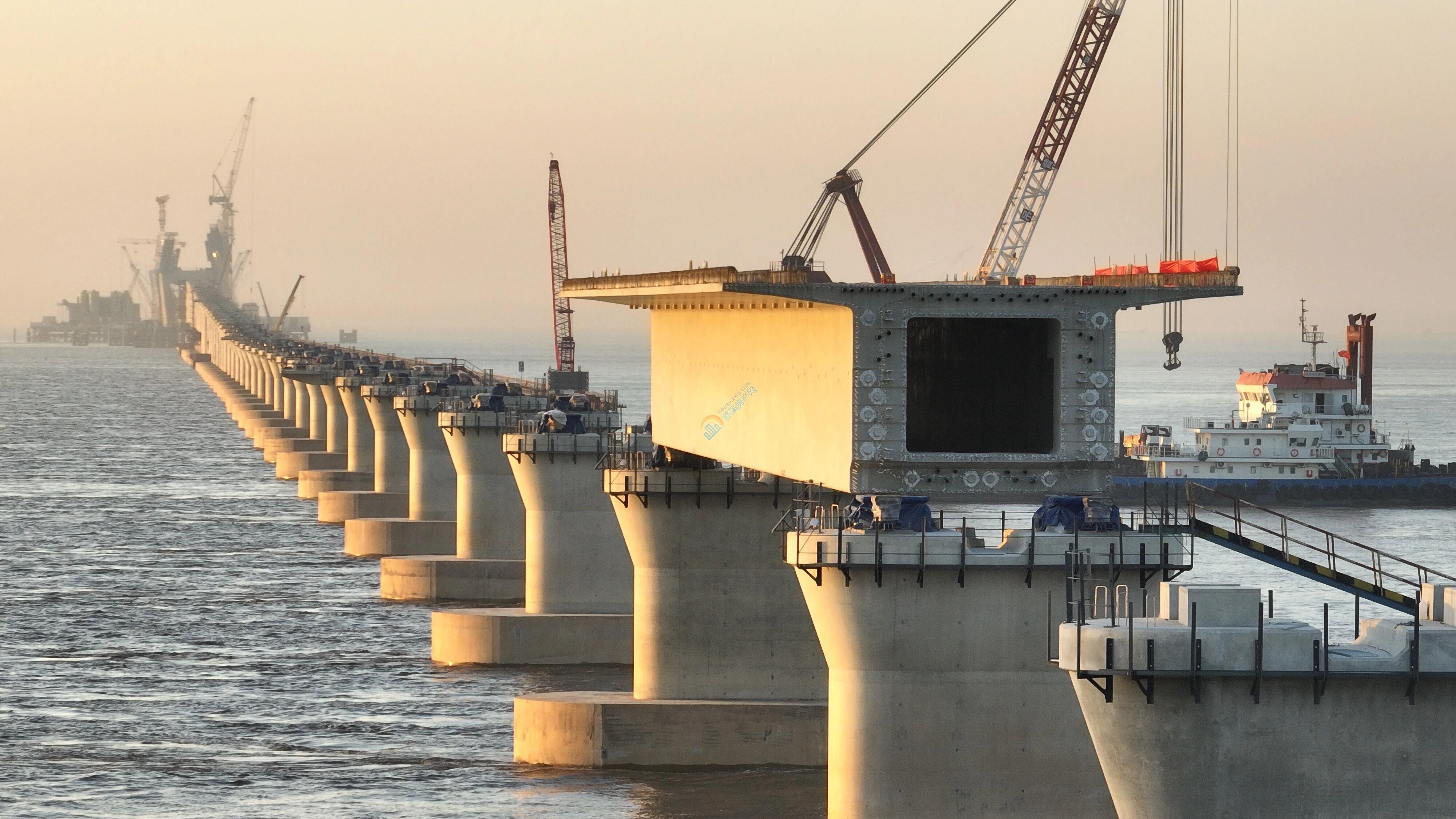 宁波侧的箱梁正在进行架设