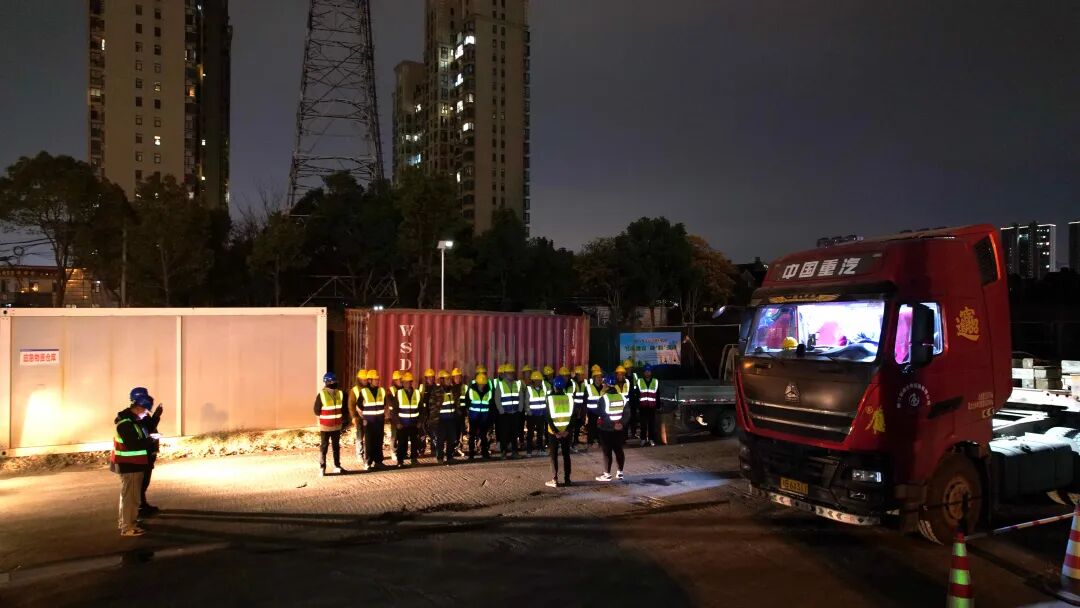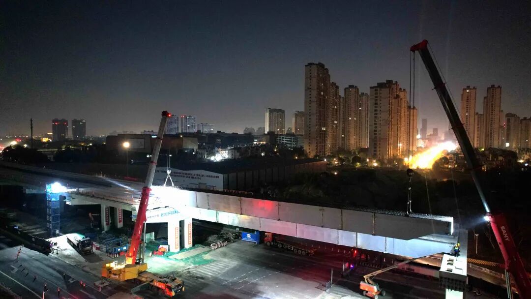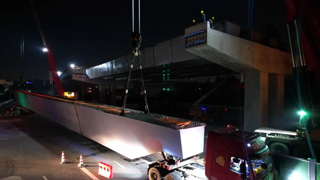据了解,此次架设分两晚进行,共计6片钢箱梁。由于作业需跨越车流密集的既有道路,面临着时间紧、任务重、交通组织转换压力大等多重困难。为此,项目管理团队坚持“方案先行、精准施策”原则,采用整体吊装工艺,并确定在夜间进行施工作业。同时,精准优化钢梁运输路线、吊机选型站位及钢梁吊装走位,大大增强吊装方案可执行性。