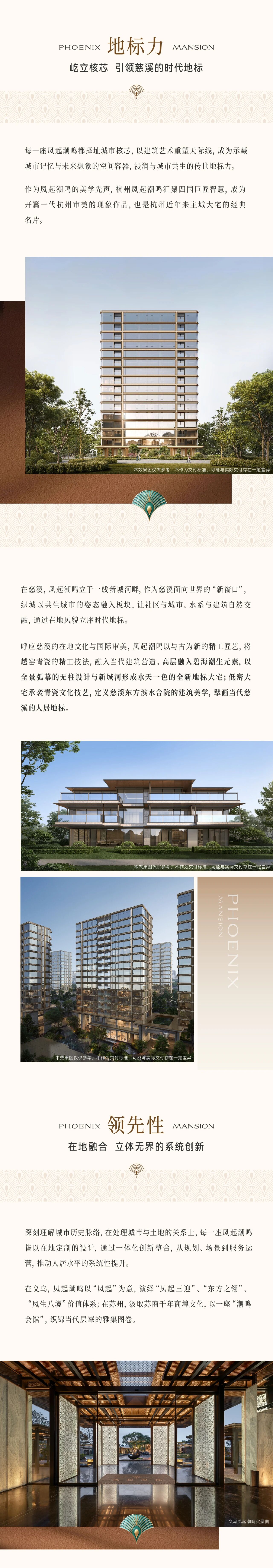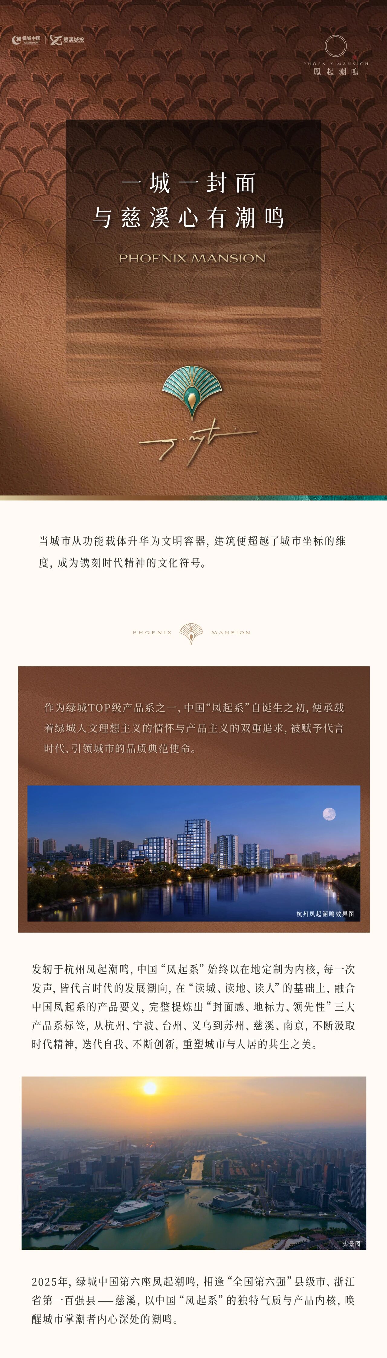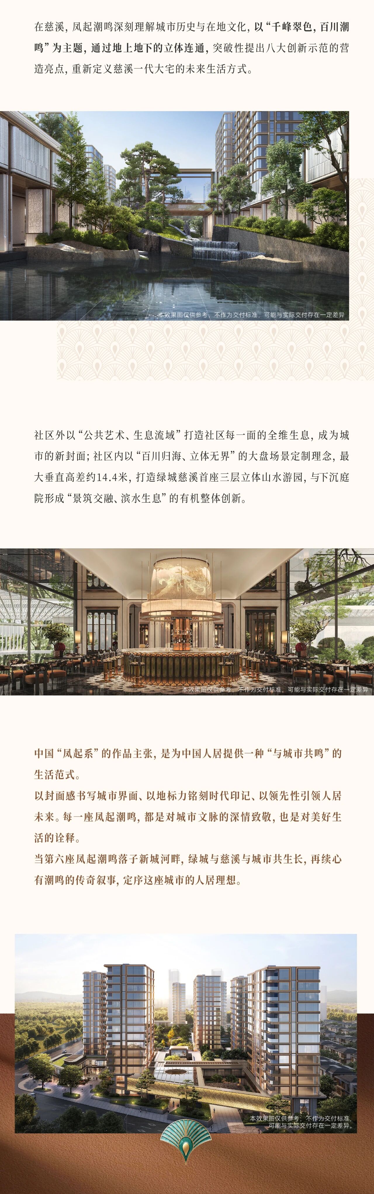 本宣传资料所有文字、数据、图片及所标尺寸等仅为本项目建设区域设计效果的表达和示意,为要约邀请,不构成要约内容,相关内容不排除因政府相关规划、规定及其他原因发生变化,一切有关房屋的具体信息以书面合同及政府最终审批文件为准。本资料中教育设施的内容不作为学区承诺,具体学区划片、入学条件件及收费标准以政府教育主管部门的规划要求及学校招生政策为准。本资料发布时间为2025年12月3日,有效期5天。本项目推广案名为【凤起潮鸣】,核准地名为【慈溪凤起潮鸣邸】,开发商【慈溪市金慈置业有限公司】。绿城中国服务热线:95059。