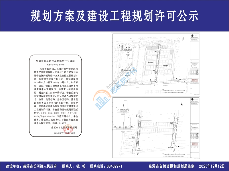 慈溪市长河镇人民政府拟申请办理南通至宁波高速铁路(长河段)征迁安置地块配套道路的规划设计方案及建设工程规划许可,现将规划方案予以公示。公示时间自2025年12月12日至2025年12月21日,如有意见、建议,请在公示期间来电或来信到市行政服务中心规划窗口。涉及重大利害关系的,利害关系人如需申请听证,请在公示结束前向我局提出申请,听证申请人须提供姓名、住址、电话号码、身份证号码、签名及证明利害关系等事项的书面材料。若无异议,我局将依申请办理规划设计方案及建设工程规划许可证。市自然资源和规划局联系电话:63961746、63961739(上午8:00-11:30,下午1:30-4:30,节假日除外),来信请寄:慈溪市三北大街777号慈溪市行政服务中心规划窗口,邮编:315300。