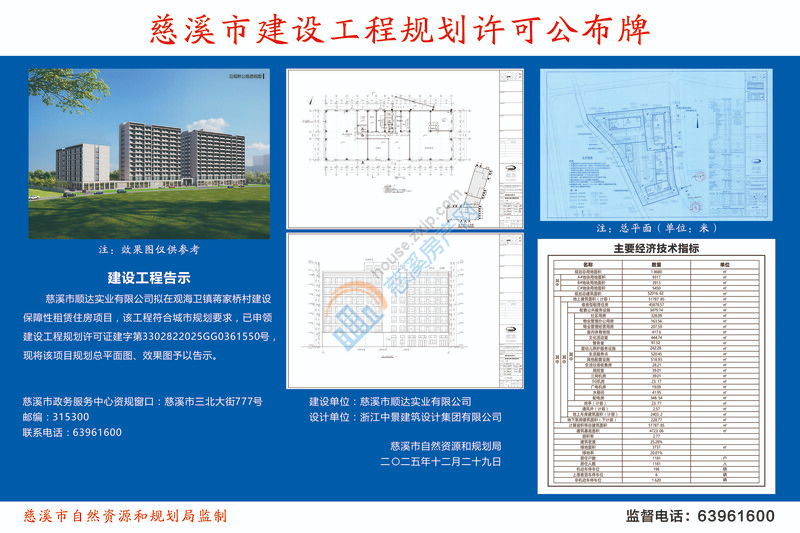 慈溪市顺达实业有限公司拟在观海卫镇蒋家桥村建设保障性租赁住房项目,该工程符合城市规划要求,已申领建设工程规划许可证建字第3302822025GG0361550号,现将该项目规划总平面图、效果图予以告示。