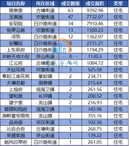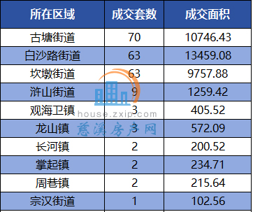 其中,古塘街道以月成交70套居于榜首,其次是白沙路街道和坎墩街道以63套的成交量并列第二。