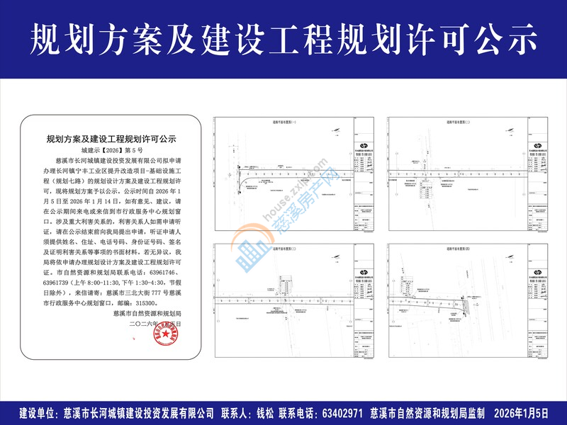 慈溪市长河城镇建设投资发展有限公司拟申请办理长河镇宁丰工业区提升改造项目-基础设施工程(规划七路)的规划设计方案及建设工程规划许可,现将规划方案予以公示。公示时间自2026年1月5日至2026年1月14日,如有意见、建议,请在公示期间来电或来信到市行政服务中心规划窗口。涉及重大利害关系的,利害关系人如需申请听证,请在公示结束前向我局提出申请,听证申请人须提供姓名、住址、电话号码、身份证号码、签名及证明利害关系等事项的书面材料。若无异议,我局将依申请办理规划设计方案及建设工程规划许可证。市自然资源和规划局联系电话:63961746、63961739(上午8:00-11:30,下午1:30-4:30,节假日除外),来信请寄:慈溪市三北大街777号慈溪市行政服务中心规划窗口,邮编:315300。