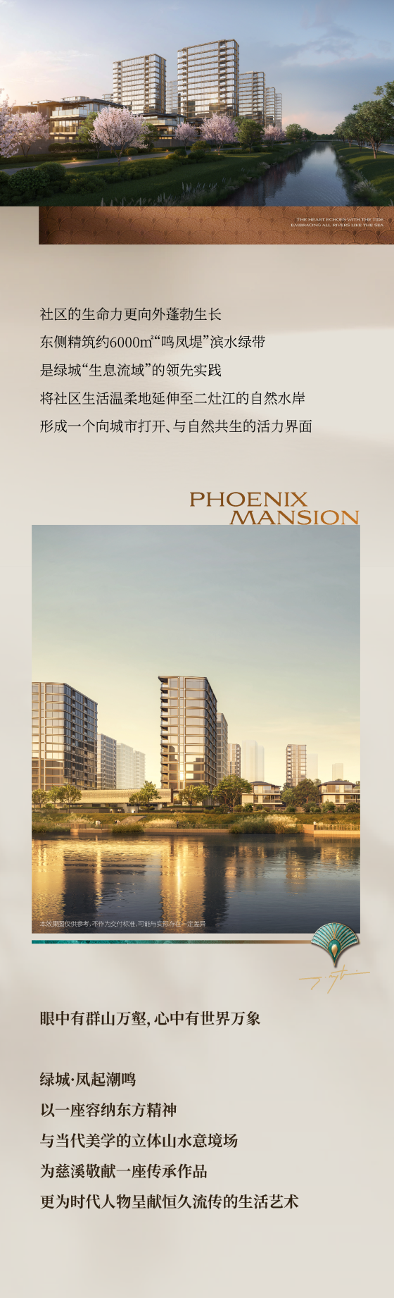 本宣传资料所有文字、数据、图片及所标尺寸不构成要约内容,相关内容不排除因政府相关规划、规定及其他原因发生变化,一切有关房屋的具体信息以书面合同及政府最终审批文件为准。本资料中教育设施的内容不作为学区承诺,具体学区划片、入学条件件及收费标准以政府教育主管部门的规划要求及学校招生政策为准。本资料发布时间为2026年1月12日,有效期5天。本项目推广案名为【凤起潮鸣】,核准地名为【慈溪凤起潮鸣邸】,开发商【慈溪市金慈置业有限公司】。绿城中国服务热线:95059。