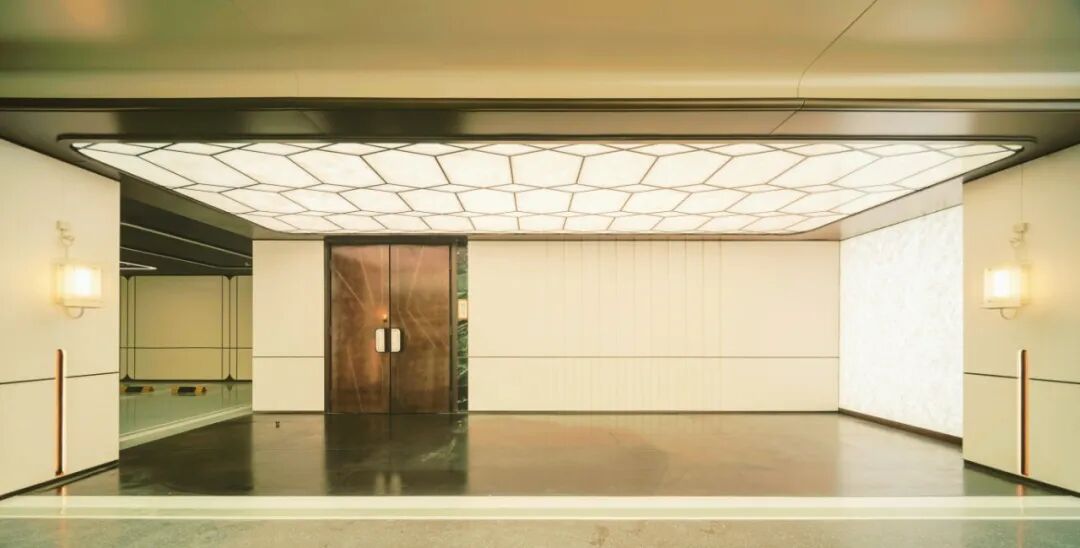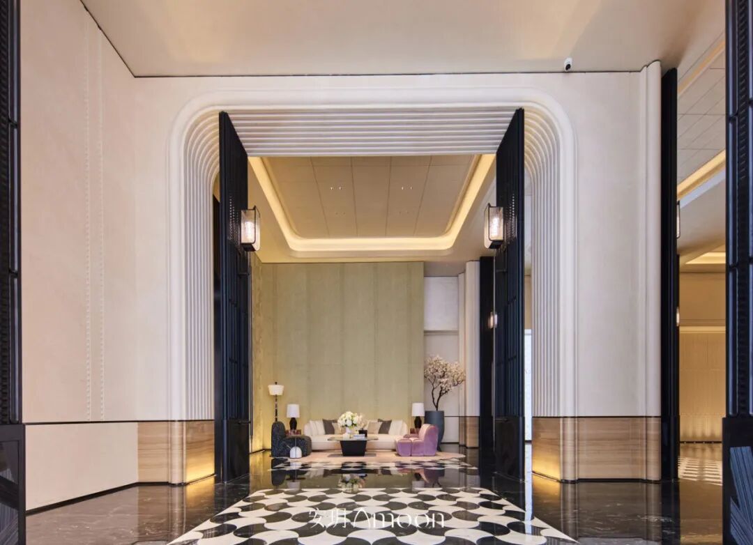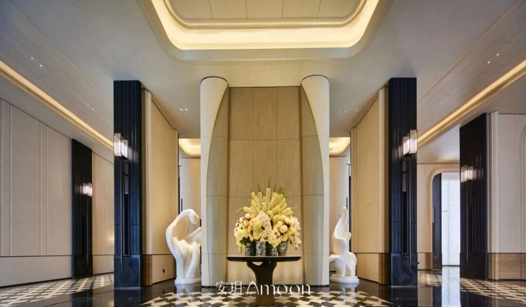 而真正将“可居住的美术馆”理念推向极致的,是步入37号楼大堂的那一刻。这里的四壁由匠人用法国莱姆石“贝莎白”手工雕琢而成,石材表面起伏的细腻纹理,在精心设计的光影下,呈现出如同高级亚麻织物般的温润质感。