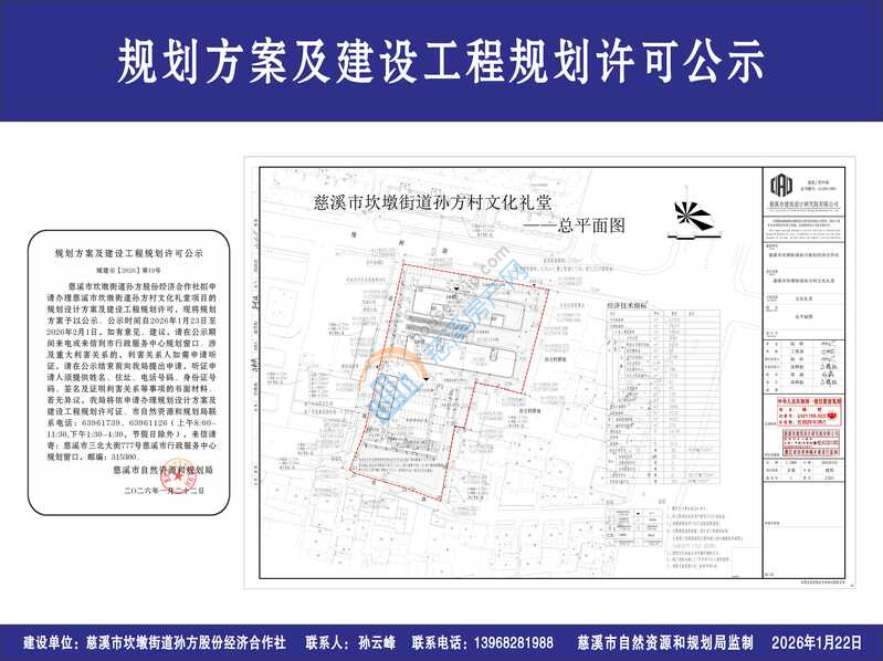 慈溪市坎墩街道孙方股份经济合作社拟申请办理慈溪市坎墩街道孙方村文化礼堂项目的规划设计方案及建设工程规划许可,现将规划方案予以公示。公示时间自2026年1月23日至2026年2月1日,如有意见、建议,请在公示期间来电或来信到市行政服务中心规划窗口。涉及重大利害关系的,利害关系人如需申请听证,请在公示结束前向我局提出申请,听证申请人须提供姓名、住址、电话号码、身份证号码、签名及证明利害关系等事项的书面材料。若无异议,我局将依申请办理规划设计方案及建设工程规划许可证。市自然资源和规划局联系电话:63961739、63961126(上午8:00-11:30,下午1:30-4:30,节假日除外),来信请寄:慈溪市三北大街777号慈溪市行政服务中心规划窗口,邮编:315300。