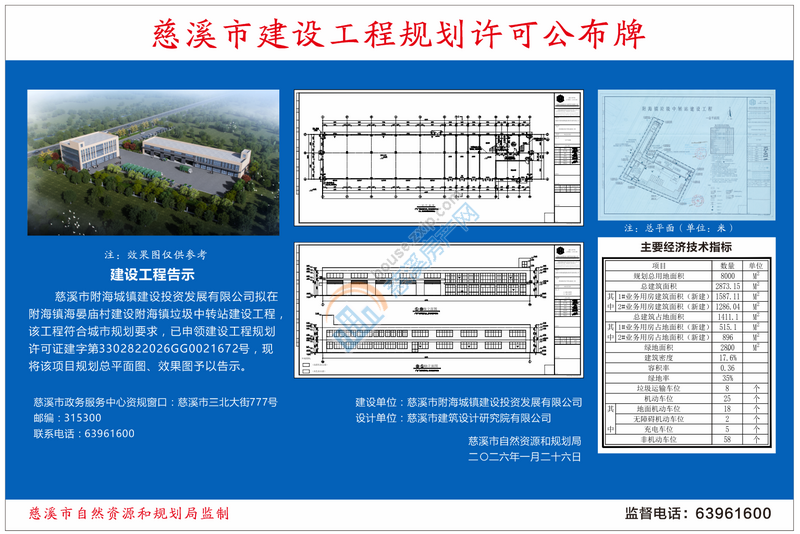 慈溪市附海城镇建设投资发展有限公司拟在附海镇海晏庙村建设附海镇垃圾中转站建设工程,该工程符合城市规划要求,已申领建设工程规划许可证建字第3302822026GG0021672号,现将该项目规划总平面图、效果图予以告示。