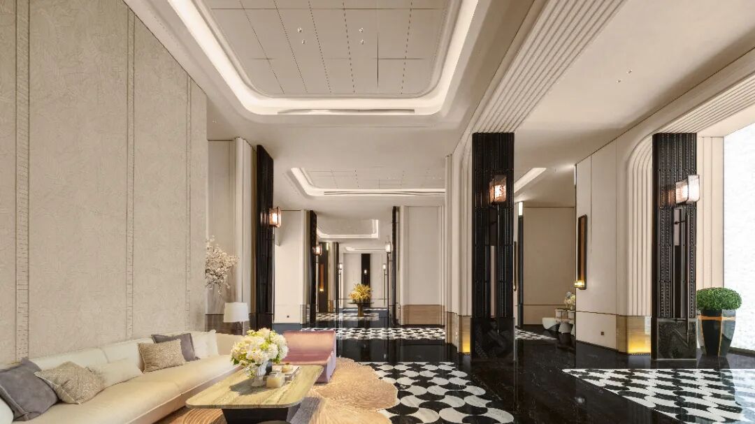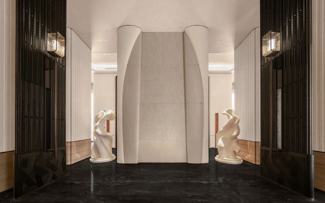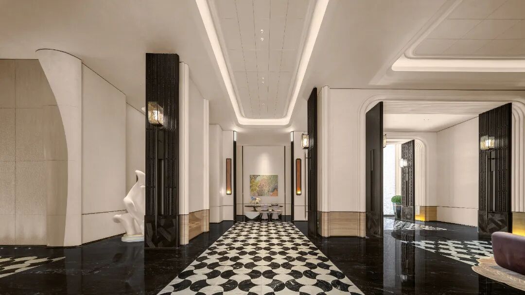 在CCD的笔下,艺术氛围贯穿于每一个微小的节点,成为可步入、可触摸、可参与的生活背景。从入户大堂中手工雕琢的法国莱姆石“贝莎白”墙面,到超高精度水刀拼花的黑白大理石地砖,再到充斥古典主义的拱形门廊与木质屏风,无一不在进行一场无声的美学对话,激发居住者内心的共鸣。
