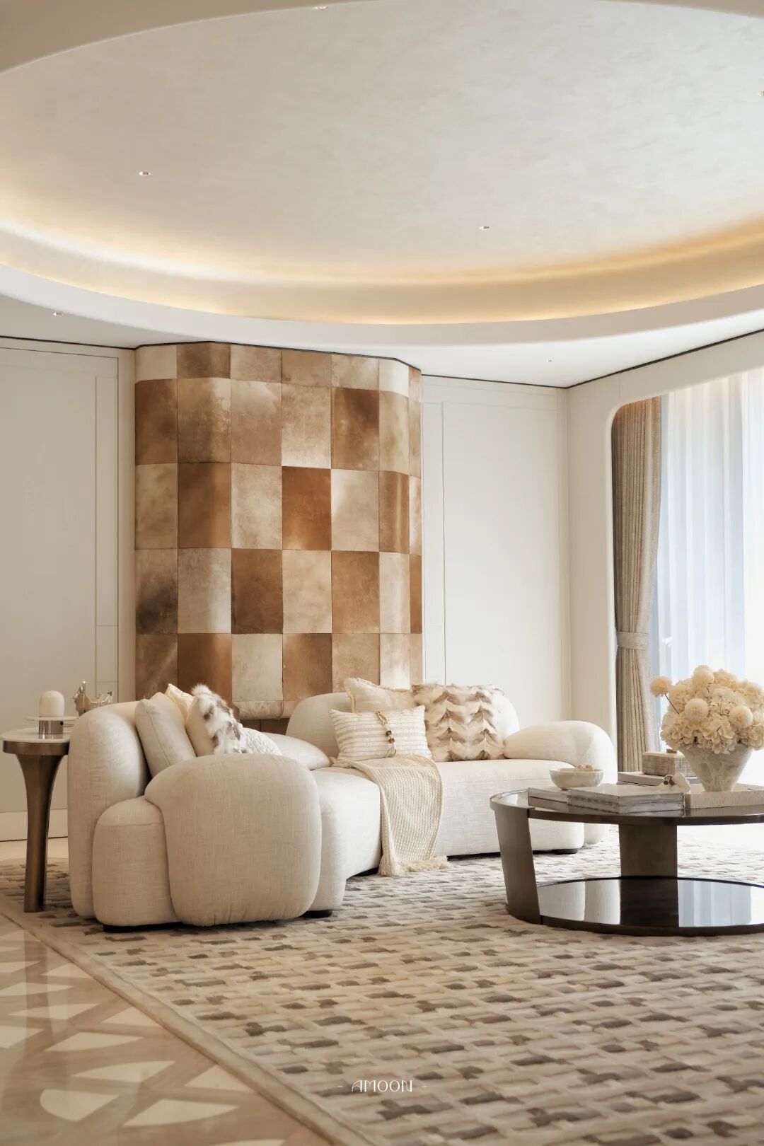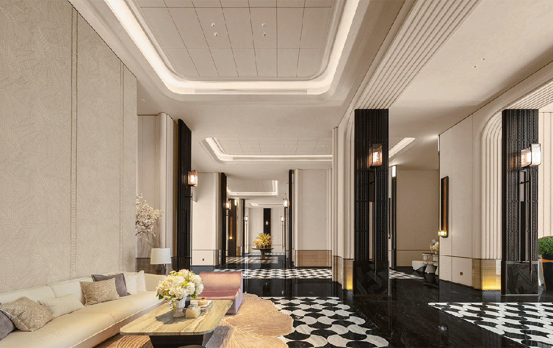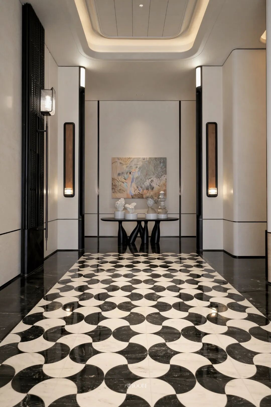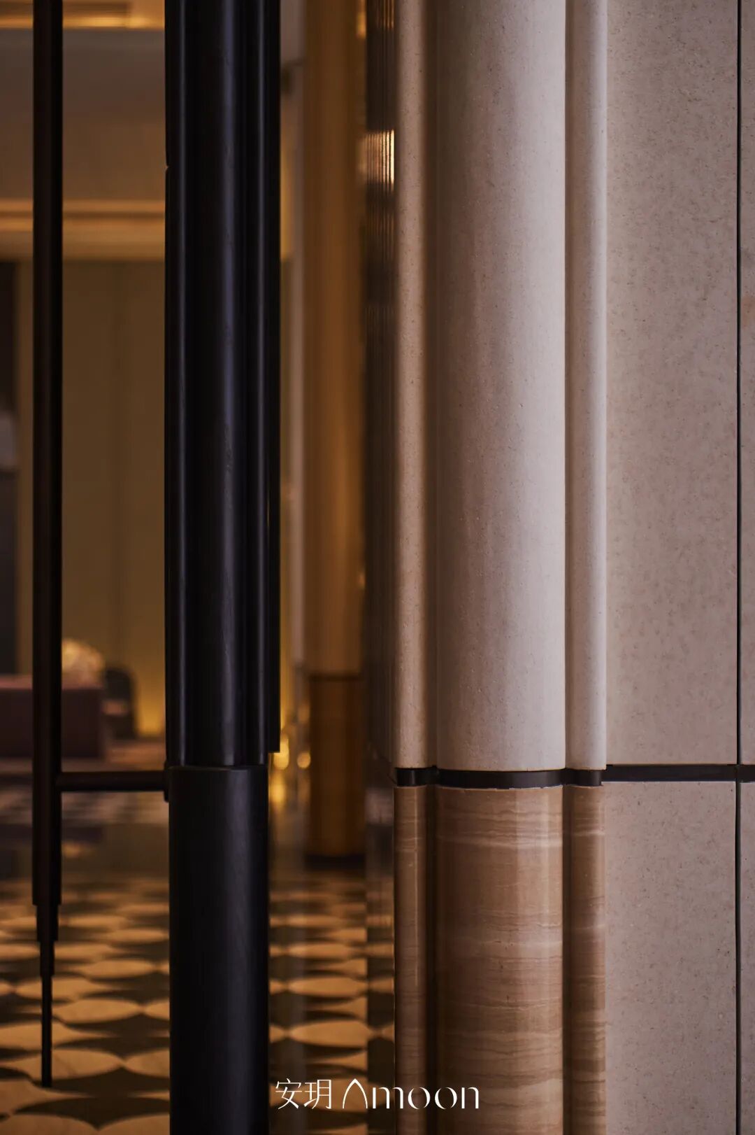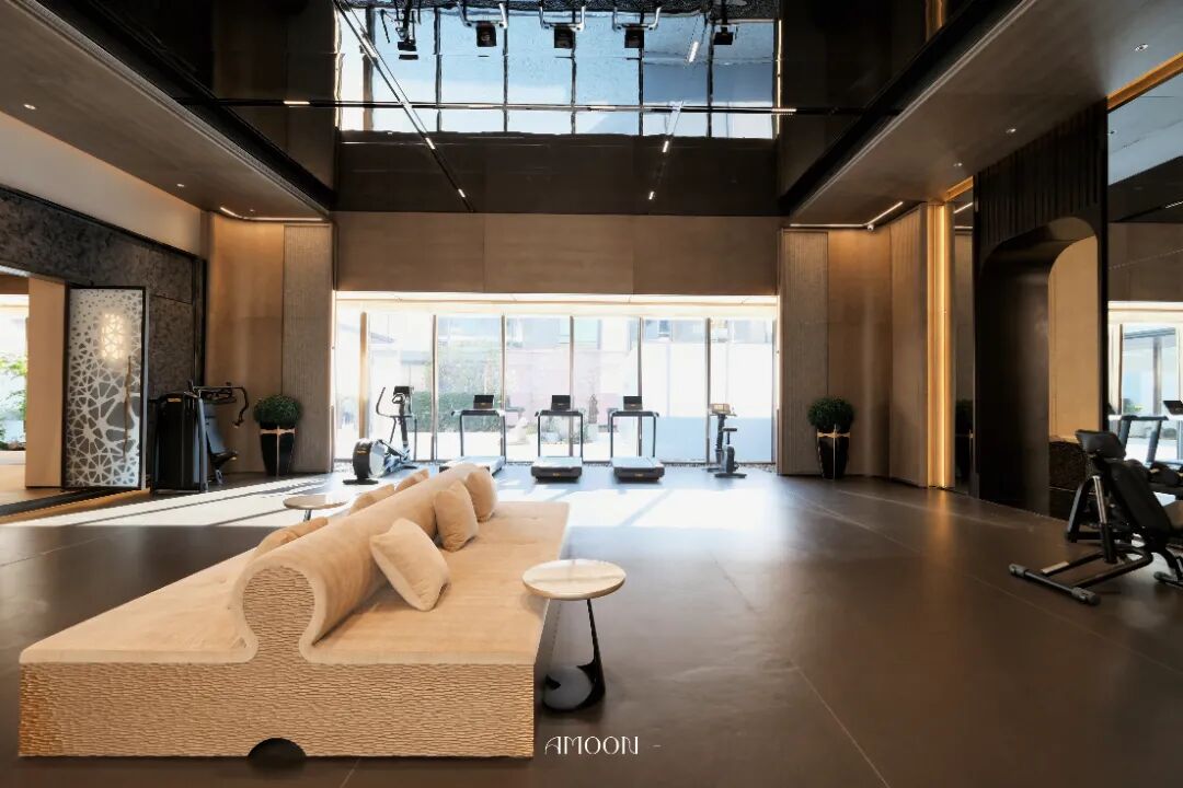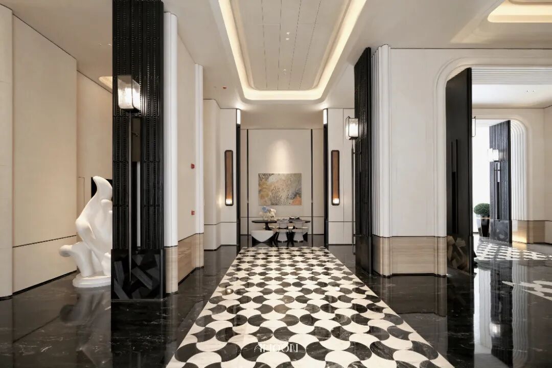 走在其中,自然而然能够感受到艺术的浓度——日光掠过手工打磨的法国莱姆石墙面,流转如绸,映照出仿佛亚麻织物般的温润质感;层层递进的海派拱门与屏风让整个空间呈现出欧式建筑的序列感;亿万年云石铺就得月光艺术地库入口,将归家的情绪瞬间拉满,而温润的穹顶光轴,既成为天然的行车引导,又让光影随动线流转,赋予空间动态的艺术感。