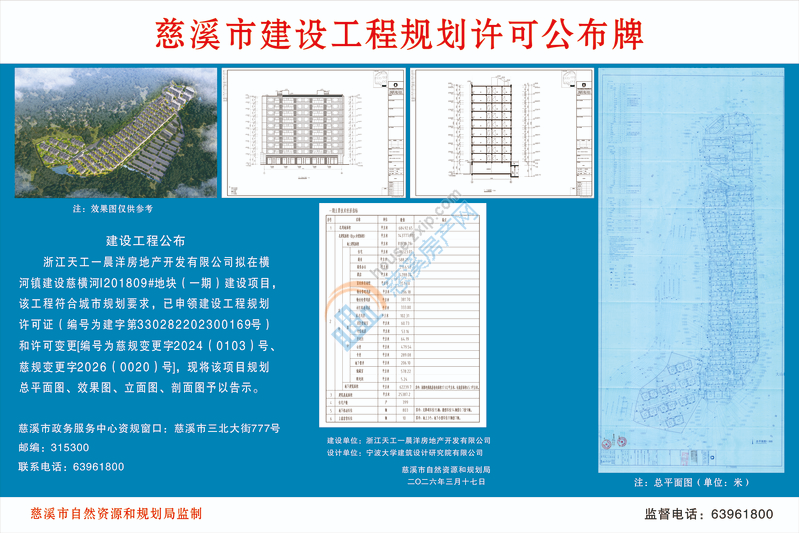 浙江天工一晨洋房地产开发有限公司拟在横河镇建设慈横河I201809#地块(一期)建设项目,该工程符合城市规划要求,已申领建设工程规划许可证(编号为建字第330282202300169号)和许可变更[编号为慈规变更字2024(0103)号、慈规变更字2026(0020)号],现将该项目规划总平面图、效果图予以告示。