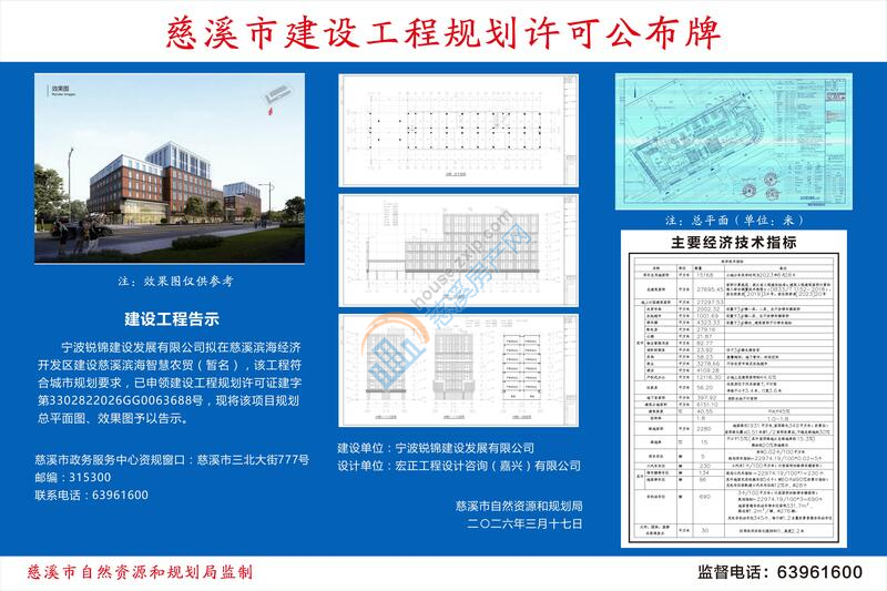 宁波锐锦建设发展有限公司拟在慈溪滨海经济开发区建设慈溪滨海智慧农贸(暂名),该工程符合城市规划要求,已申领建设工程规划许可证建字第3302822026GG0063688号,现将该项目规划总平面图、效果图予以告示。