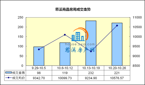 慈溪上周(10.20-10.26)成交各类房源(含住宅、公寓、商铺、写字楼和车库)共计221套,成交均价10576.57元/㎡,成交面积28658方。环比上上周成交量下跌4.74%,成交均价上涨12.69%,成交面积上涨41.83%。
