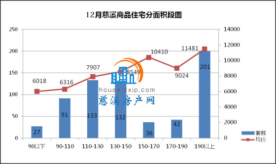 12月慈溪商品住宅分面积段成交中,190㎡以上面积段为最热门户型,共计201套,成交均价11481元/㎡,占总成交套数的30%;110-130㎡面积段产品成交133套,成交均价7907元/㎡,占总成交套数的20%,销量排名第二;130-135㎡面积段产品成交132套,成交均价8549元/㎡,占总成交套数的20%,销量排名第三。