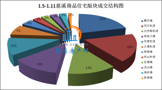 慈溪商品住宅各版块成交情况中,城区版块(浒山街道、古塘街道、白沙路街道、宗汉街道、坎墩街道)共成交37套,成交均价10265.64元/㎡。排名前三版块:横河镇备案15套,占21%;宗汉街道备案13套,占18%;白沙路街道与观海卫镇各备案9套,各占13%。