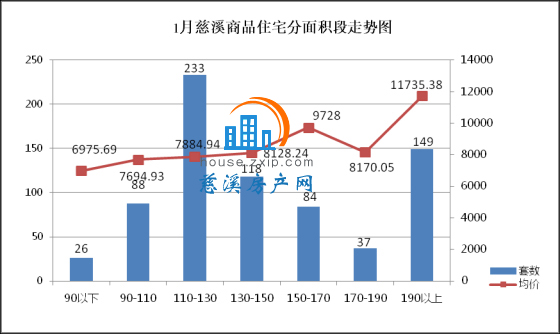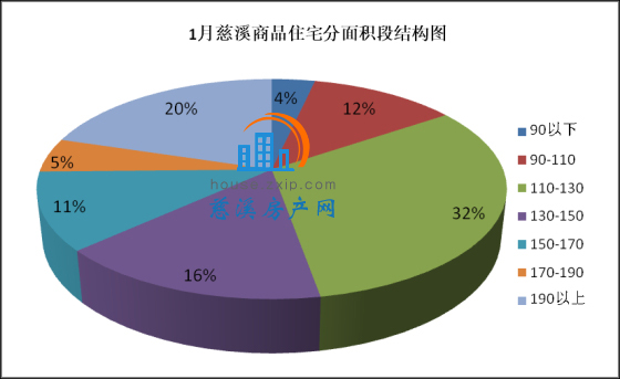 1月慈溪商品住宅分面积段成交中,110-130㎡面积段为最热门户型,共计233套,成交均价7884.94元/㎡,占总成交套数的32%;190㎡以上面积段产品成交149套,成交均价11735.38元/㎡,占总成交套数的20%,销量排名第二;130-150㎡面积段产品成交118套,成交均价8128.24元/㎡,占总成交套数的16%,销量排名第三。