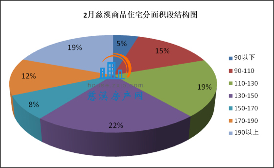 2月慈溪商品住宅分面积段成交中,130-150㎡面积段为最热门户型,共计75套,成交均价8661.41元/㎡,占总成交套数的22%;190㎡以上面积段产品成交66套,成交均价12020.21元/㎡,占总成交套数的19%,销量排名第二;110-130㎡面积段产品成交65套,成交均价7990.65元/㎡,占总成交套数的19%,销量排名第三。