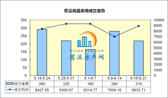 慈溪上周(6.15-6.21)成交各类房源(含住宅、公寓、商铺、写字楼和车库)共计218套,成交均价8933.71元/㎡,成交面积25319方。环比上上周成交量下跌22.14%,成交均价上涨27.45%,成交面积下跌13.33%。