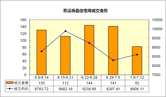 上周(7.6-7.12)慈溪楼市成交回落明显,各类房源(含住宅、公寓、商铺、写字楼和车库)共计成交150套,成交均价8545.60元/㎡,成交面积14769方。环比上上周成交量下跌42.08%,成交均价上涨3.43%,成交面积下跌38.28%。