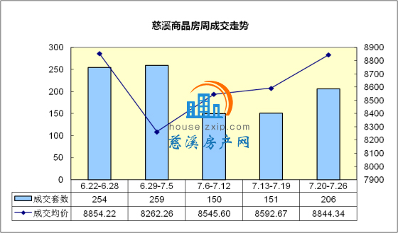在宁波刚出台的购房补贴新政的推动下,上周慈溪楼市量价齐涨,新房成交量大增,楼市继续回暖。据统计,上周(7.20-7.26)成交各类房源(含住宅、公寓、商铺、写字楼和车库)共计成交206套,成交均价8844.34元/㎡,成交面积20739方。环比上上周成交量上涨36.42%,成交均价上涨2.93%,成交面积上涨26.26%。
